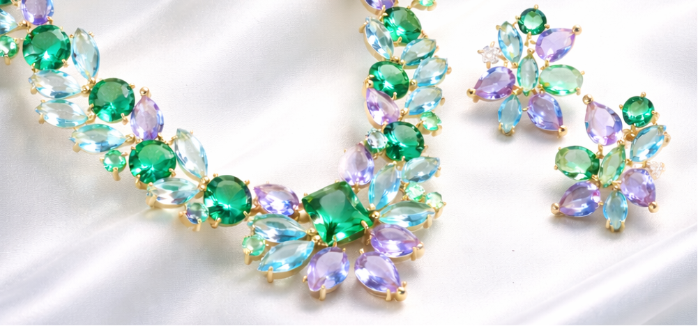 We use genuine natural crystals and cubic zirconia. Natural crystals are laboratory-finished, and diamond-like stones are cubic zirconia. No plastic or fake stones.
